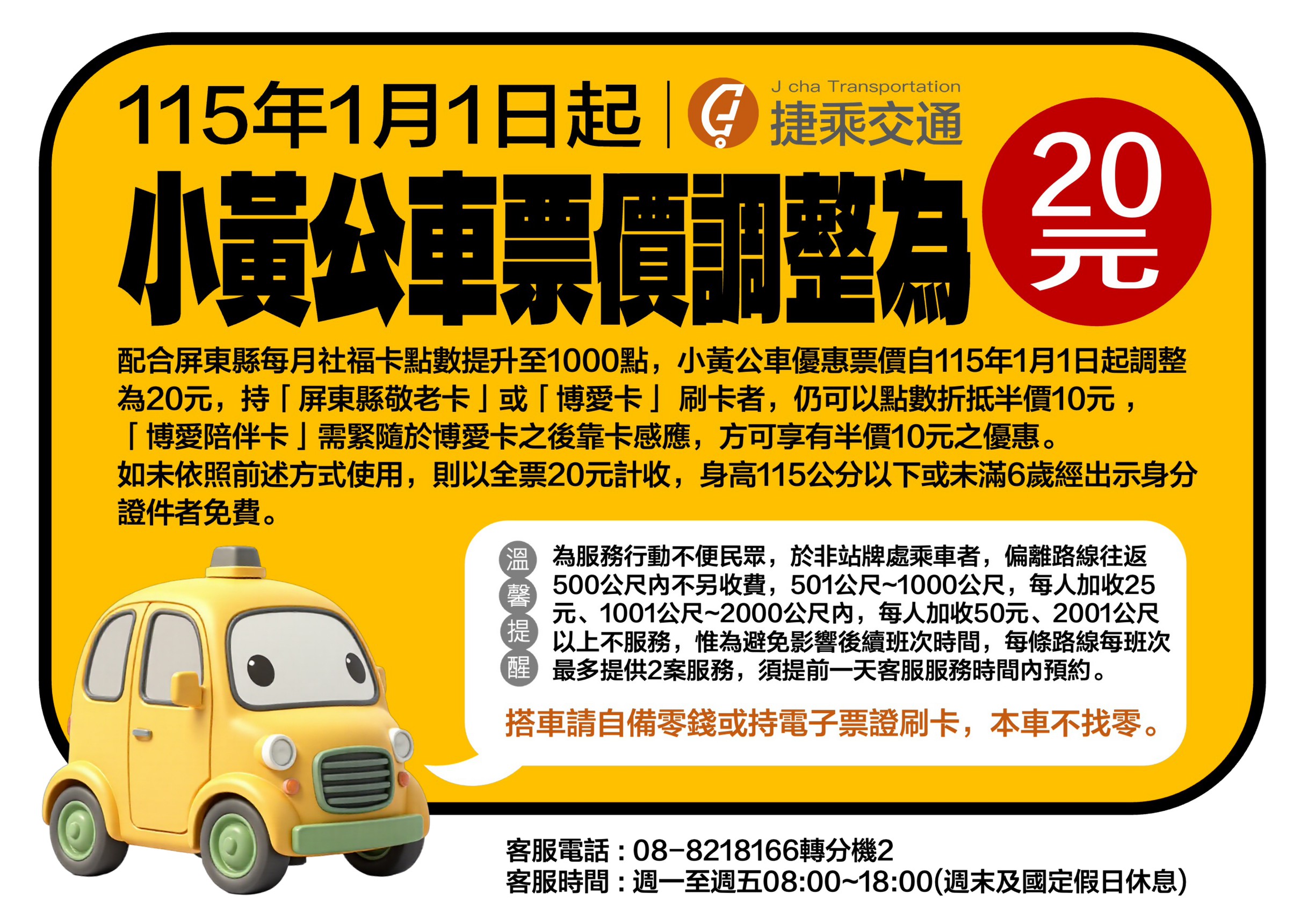 注意!!!115/1/1(四)起屏東小黃公車票價調漲至20元,繞路加收調漲,詳見公告
