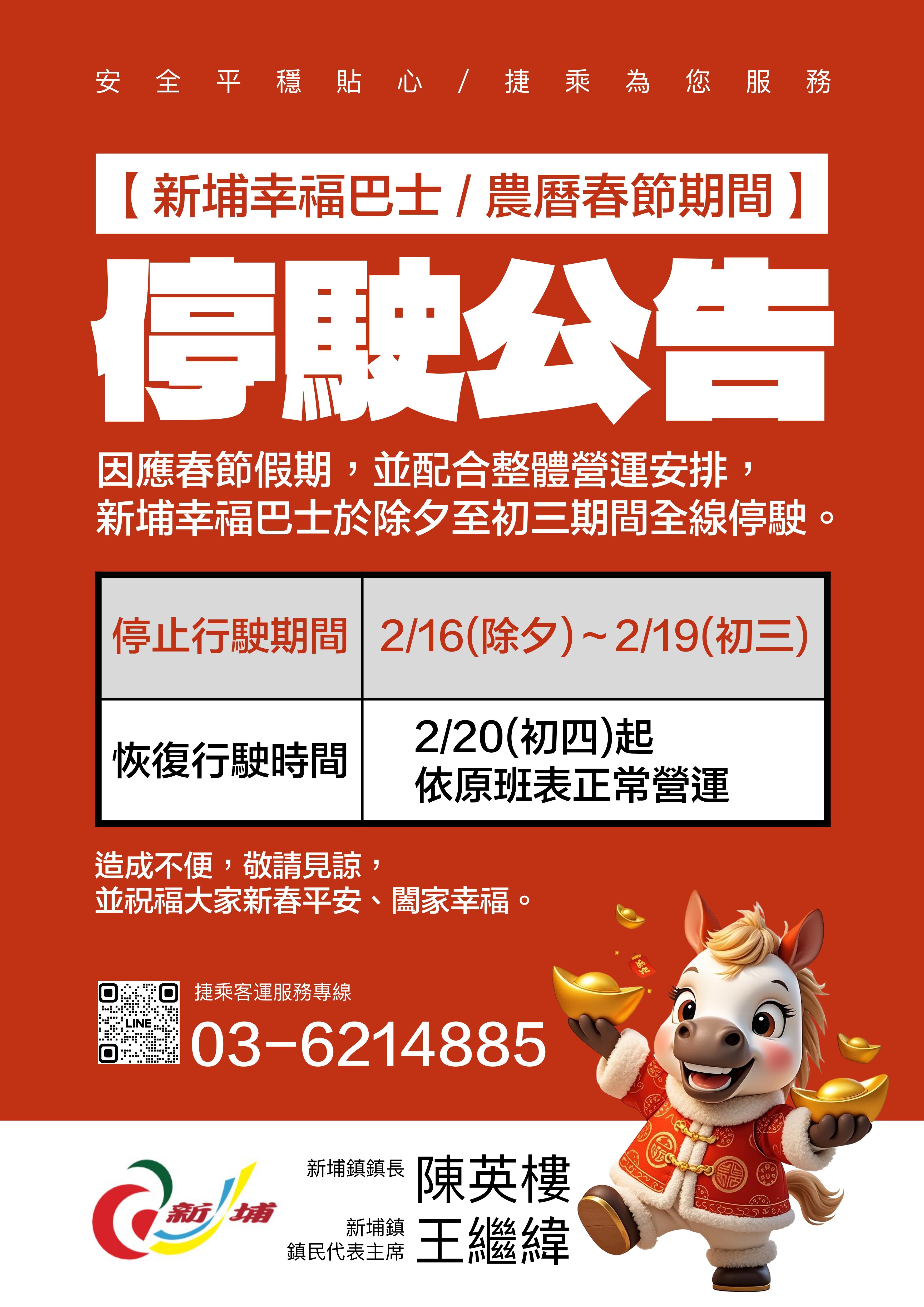 因應春節假期,新埔鎮公所幸福巴士於停駛115/2/16(除夕)~2/19(初三)。2/20(初四)恢復正常營運