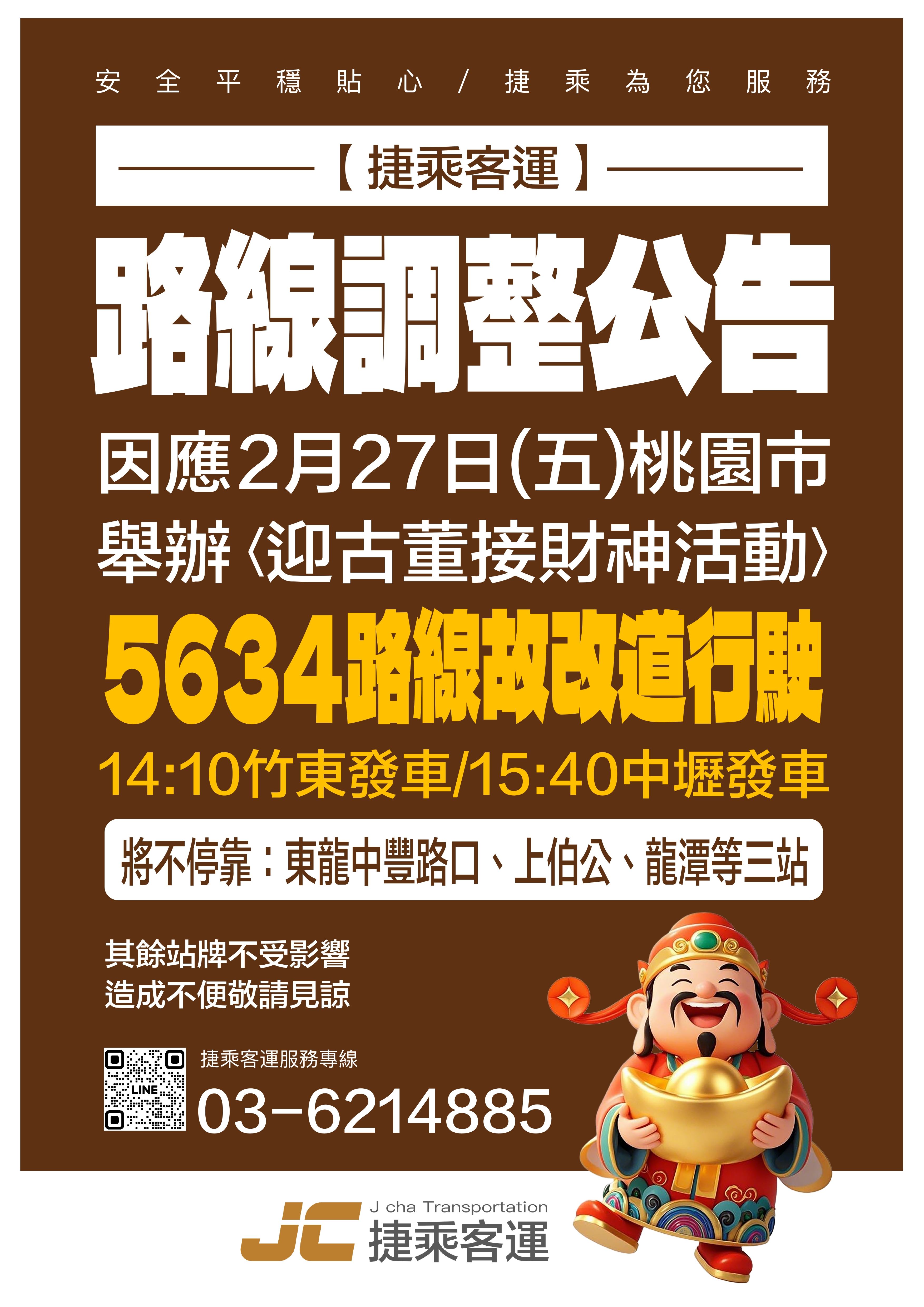 因應2/27(五)桃園市舉辦迎古董接財神活動,5634路線改道行駛通知