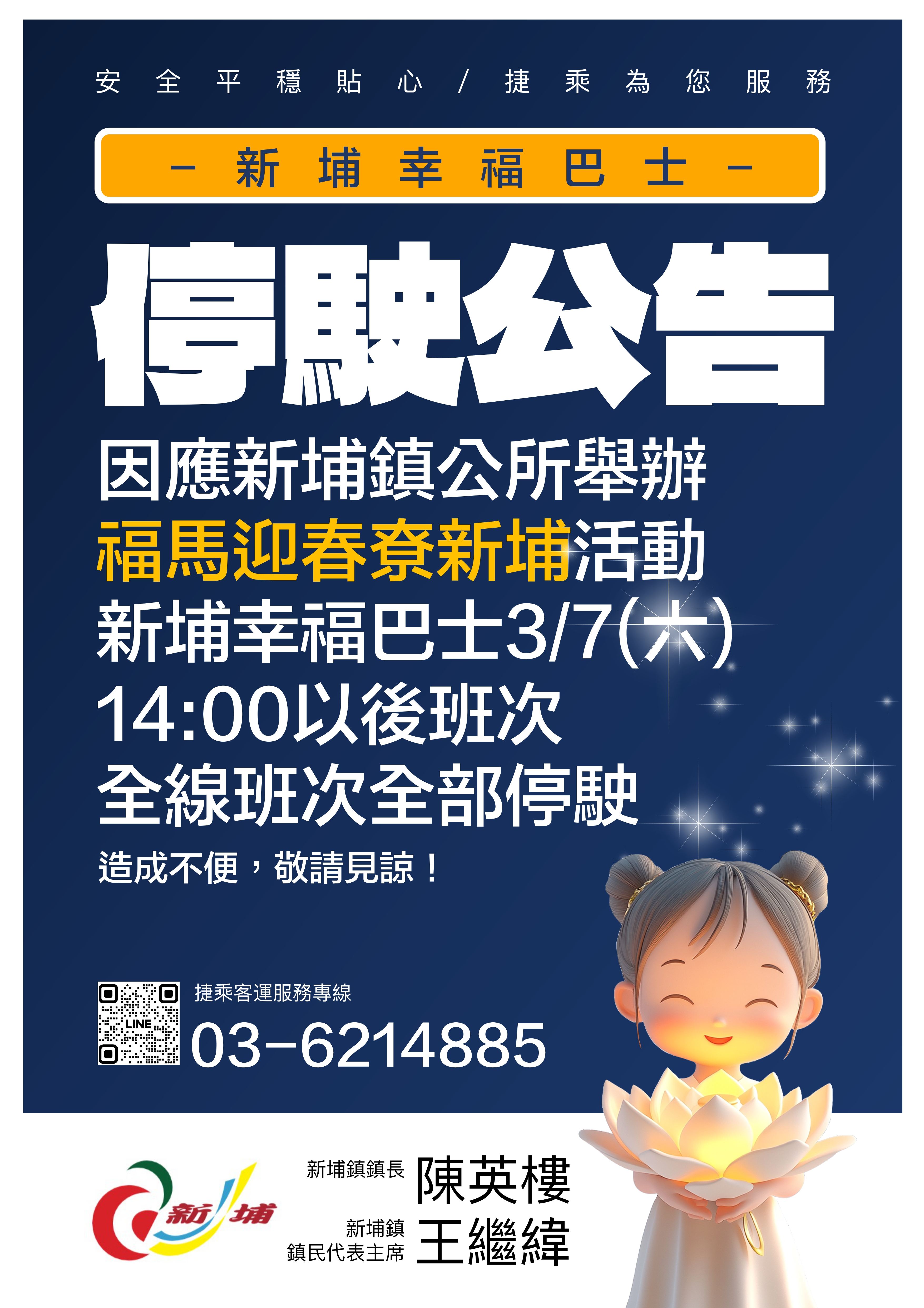 因應新埔鎮公所舉辦福馬迎春寮新埔活動於3/7(六)14:00以後班次全線停駛通知