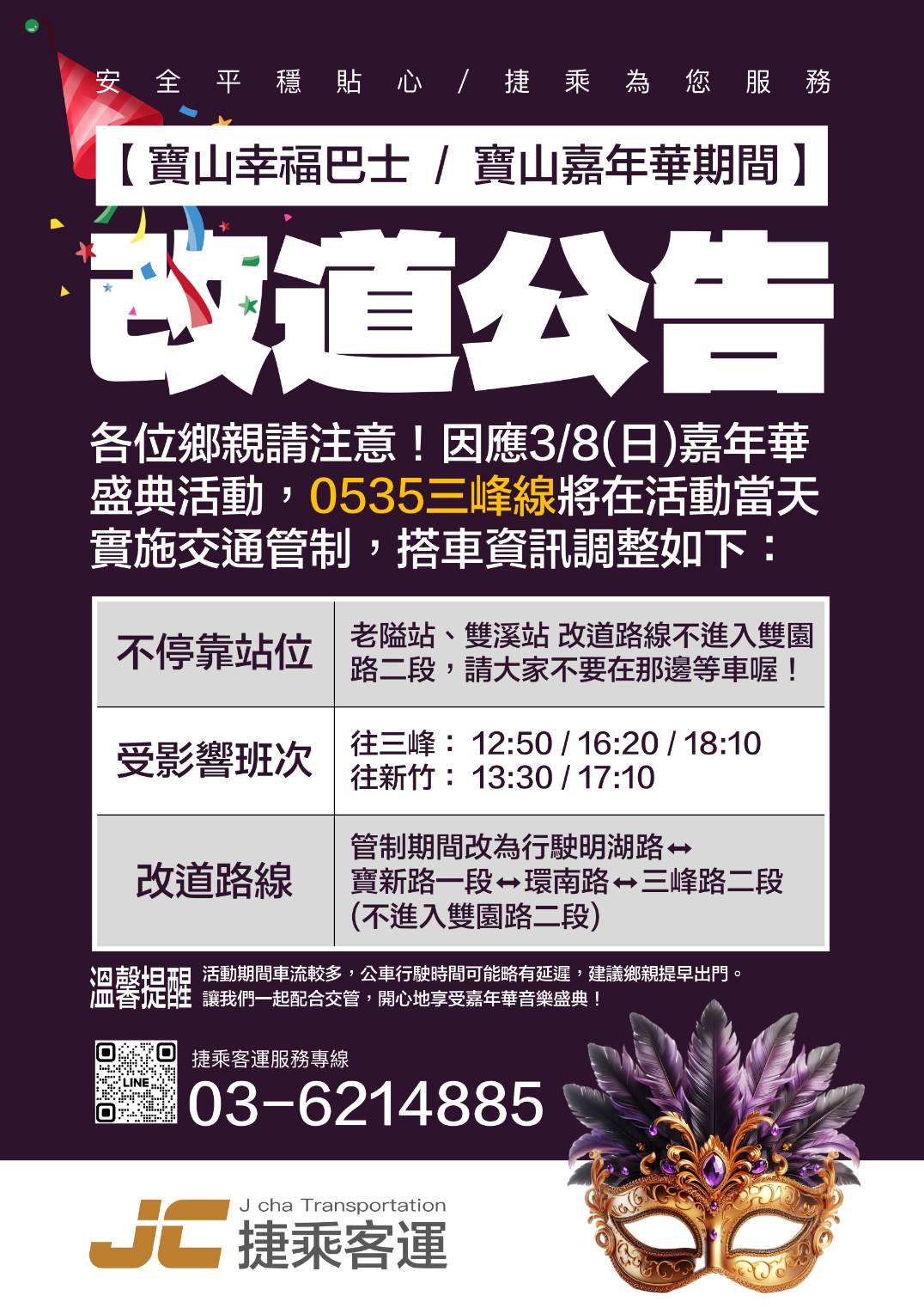 因應115/3/8(日)嘉年華盛典活動,0535三峰線將在活動當天進行交通管制。